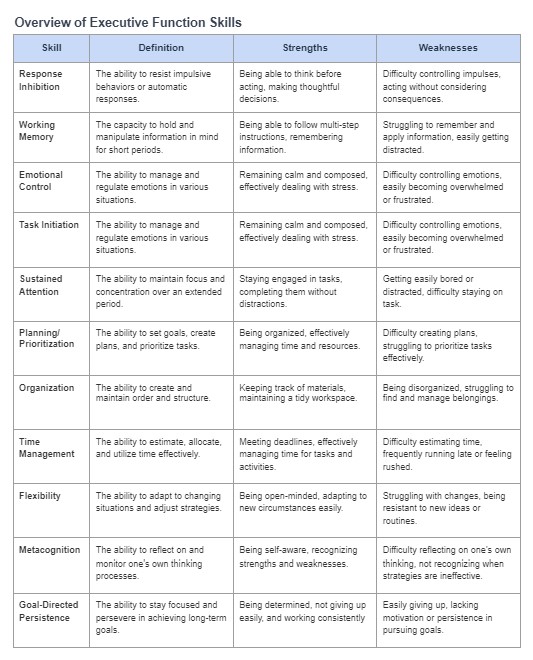 Assessing executive abilities in both yourself and your child is an important exercise that offers insights into shared strengths and weaknesses, as well as areas where differences may arise. Executive skills are essential cognitive capabilities that encompass planning, organizing, time management, sustained attention, cognitive flexibility, emotional regulation, and more.
